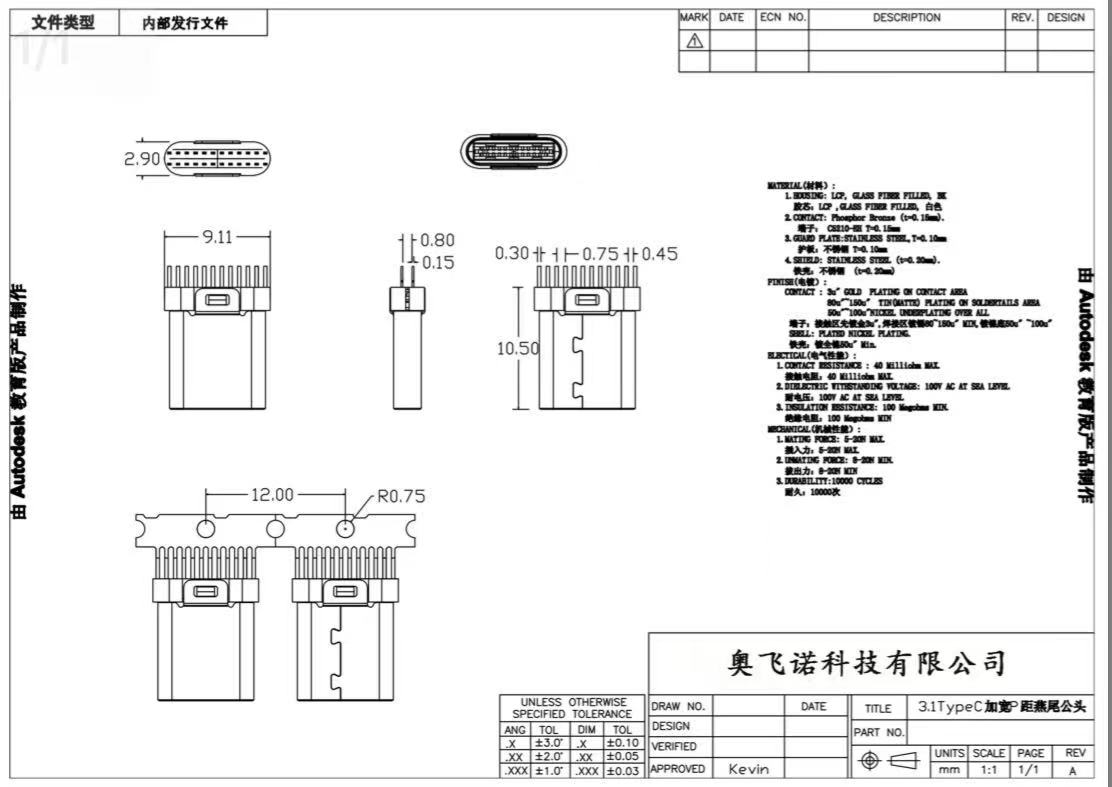 USB連接器3.1TYPE C公頭連接器24P 夾板0.8MM