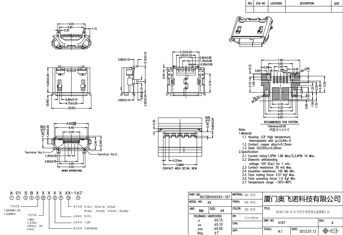MICRO ISN 5P母座 牛角型4.85前7.2 前插后貼腳 卷邊SMT