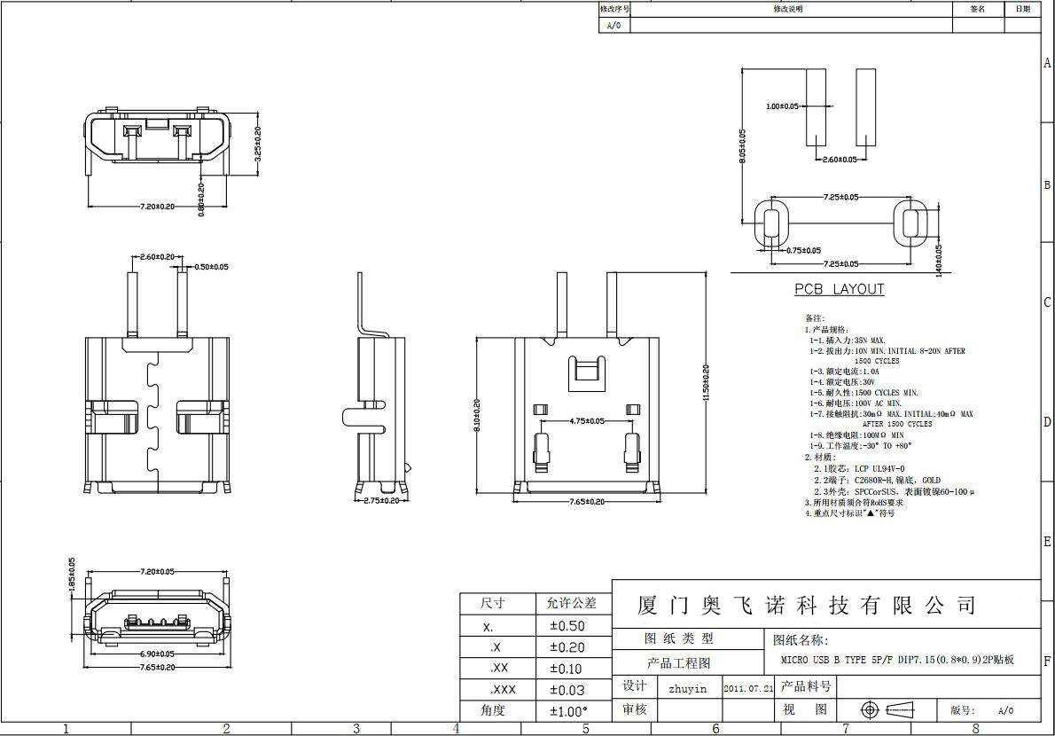 MICRO USB 2P母座 90度前插后貼 SMT 針貼片 卷邊