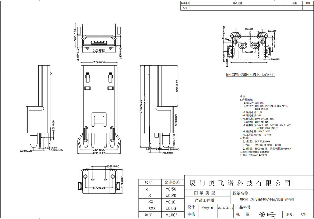 MICRO USB 2P母座 180度加高立式插板 14MM長 彎腳直邊