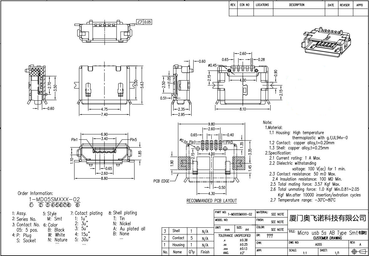 MICRO USB 5P AB型母座 兩腳全貼SMT 有柱卷邊 方形口