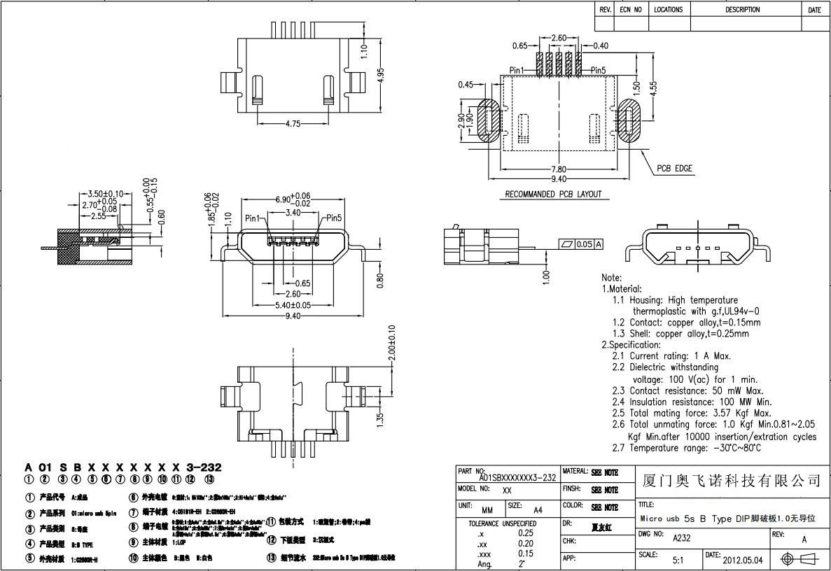 MICRO USB 5P 沉板1.0 DIP兩腳插板 SMT直邊