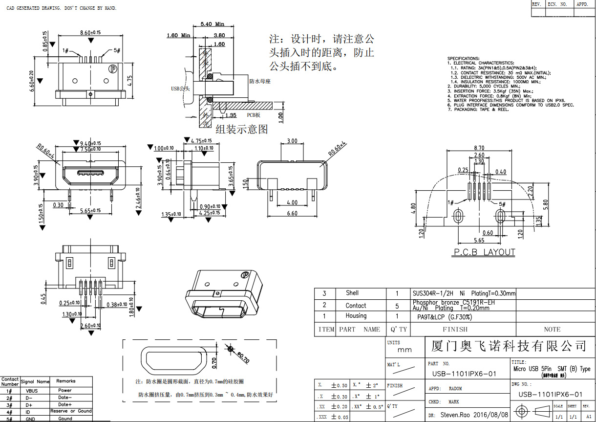 MICRO USB 5P防水母座 5.9插腳 無(wú)柱 大電流