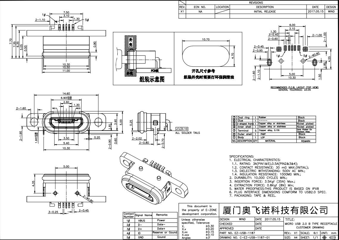 MICRO USB 5P防水母座 IPX8防水等級(jí) 帶螺孔全貼