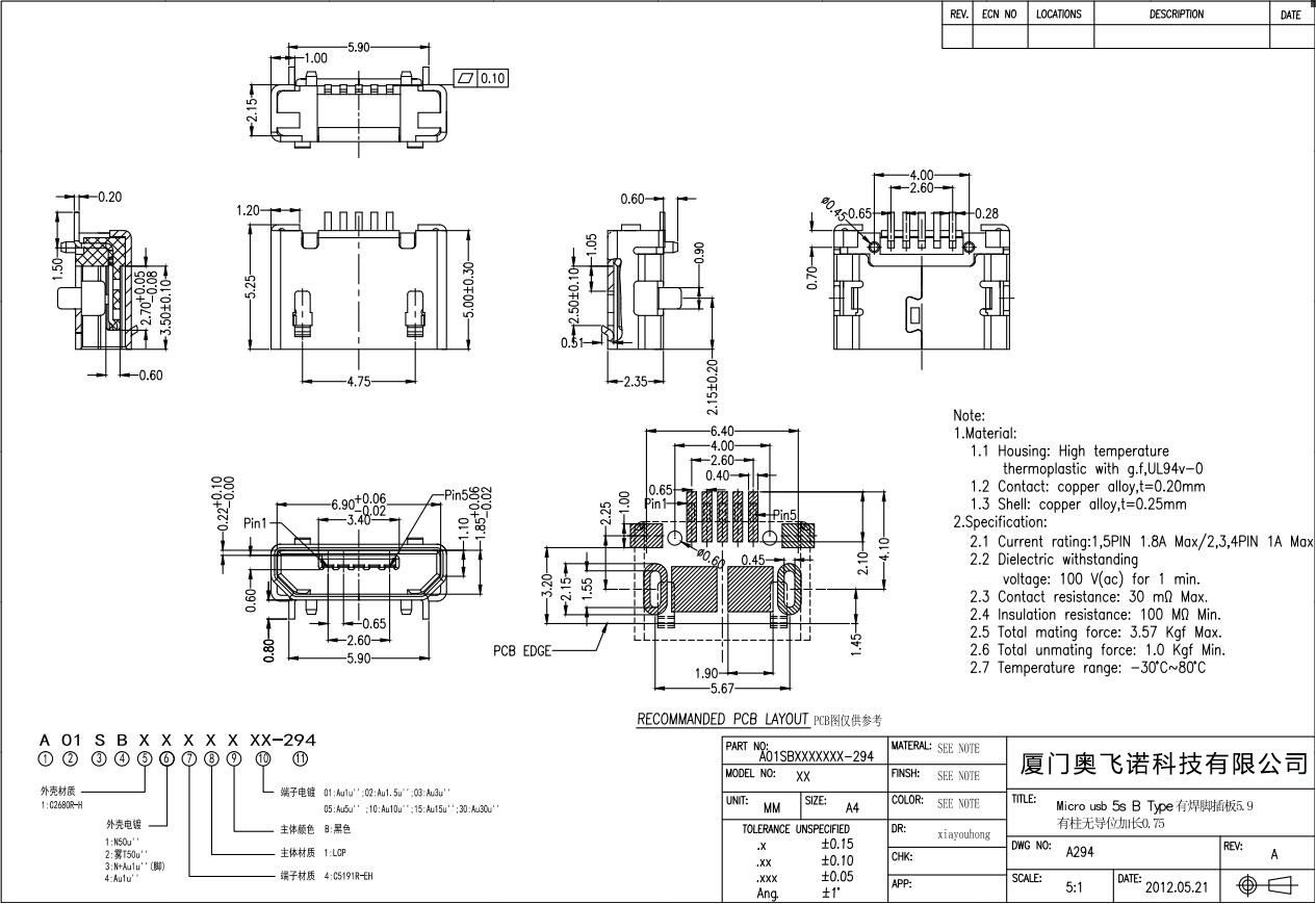 MICRO USB 5P母座 5.95.65插腳 有柱加焊腳 針加長(zhǎng)0.75 直邊