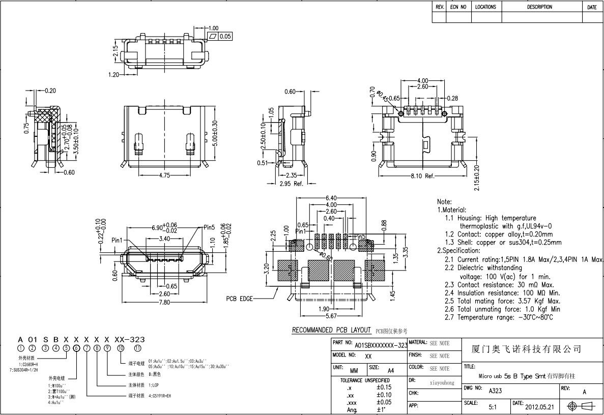 MICRO USB 5P母座 B型SMT全貼 有柱加焊腳 卷邊直邊