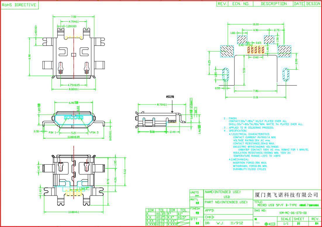 MICRO USB 5P母座 沉板0.7 前插后貼 卷邊