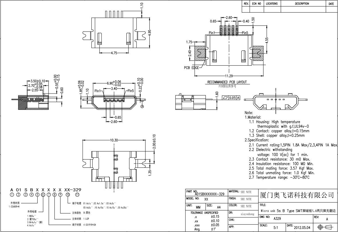 MICRO USB 5P母座 沉板1.61.0 SMT 兩腳全貼 直邊