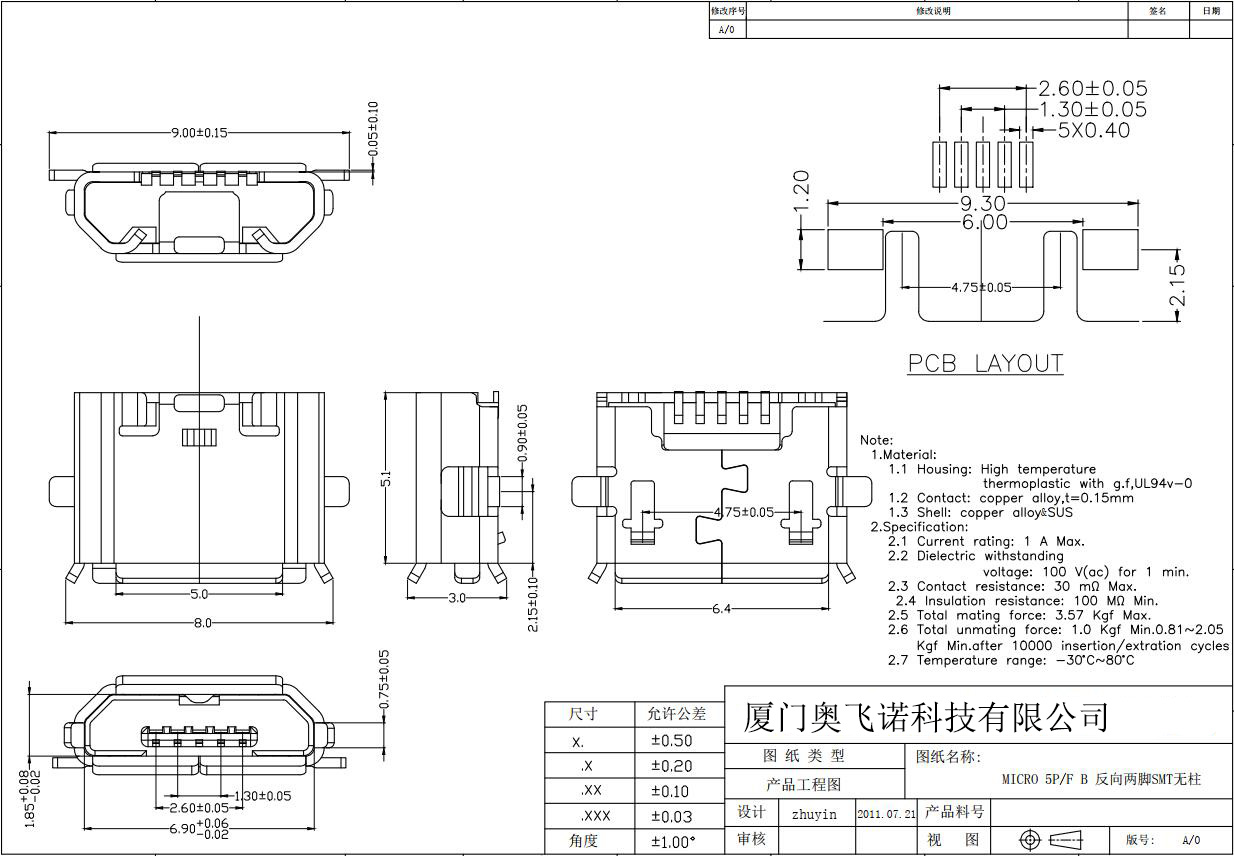 MICRO USB 5P母座 反向兩腳全貼 無(wú)柱卷邊B型