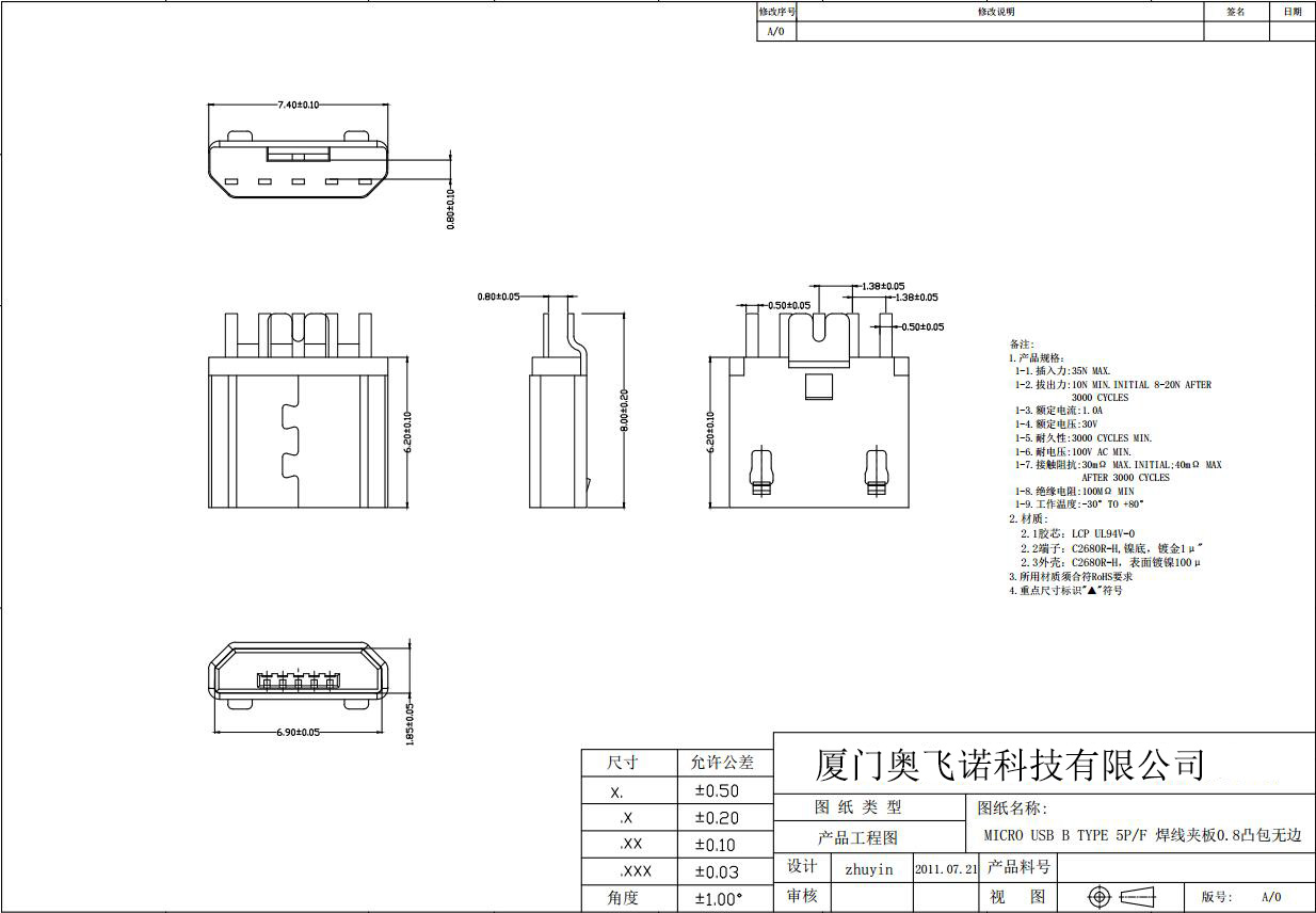 MICRO USB 5P母座 夾板0.8 焊線式 卷邊