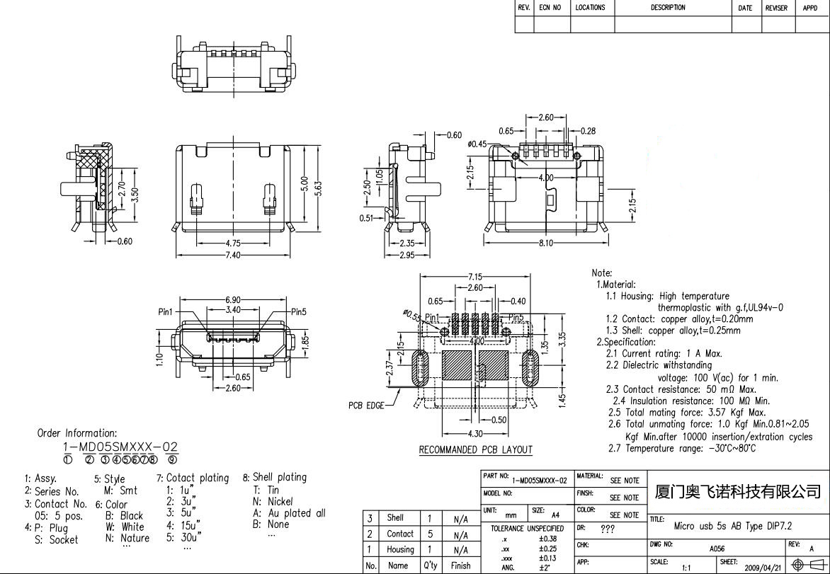 MICRO USB 5P母座AB型口 7.27.15插腳 有柱針加長0.75 卷邊
