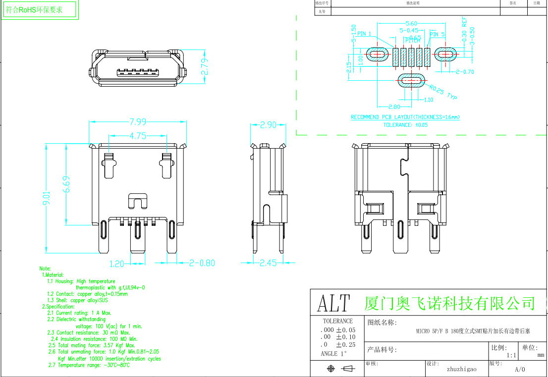 MICRO USB母座 180度立貼6.7H 三只腳插板 卷邊