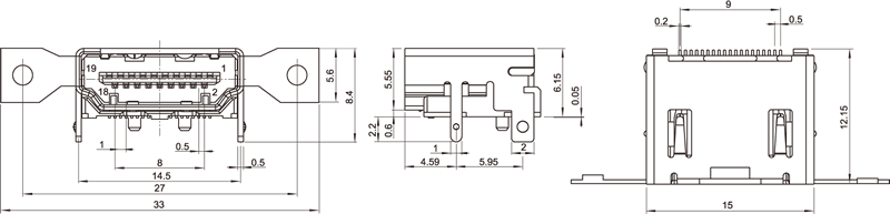 HDMI 19P母座 A型口 90度四腳插板 帶雙耳螺孔
