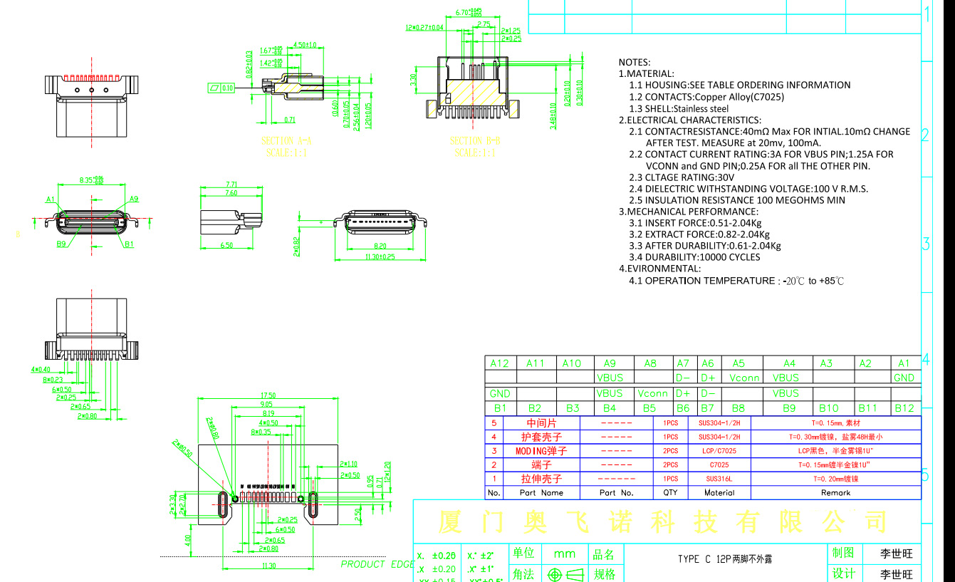 TYPE C 12P防水母座 沉板后兩腳插板 單排SMT 拉伸殼