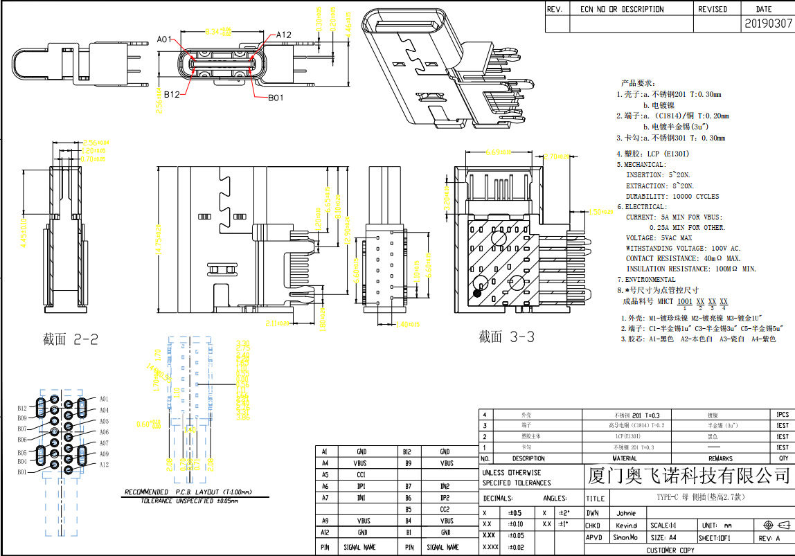 TYPE C 14P母座 長體側(cè)插式加高 墊高母座 四腳插板