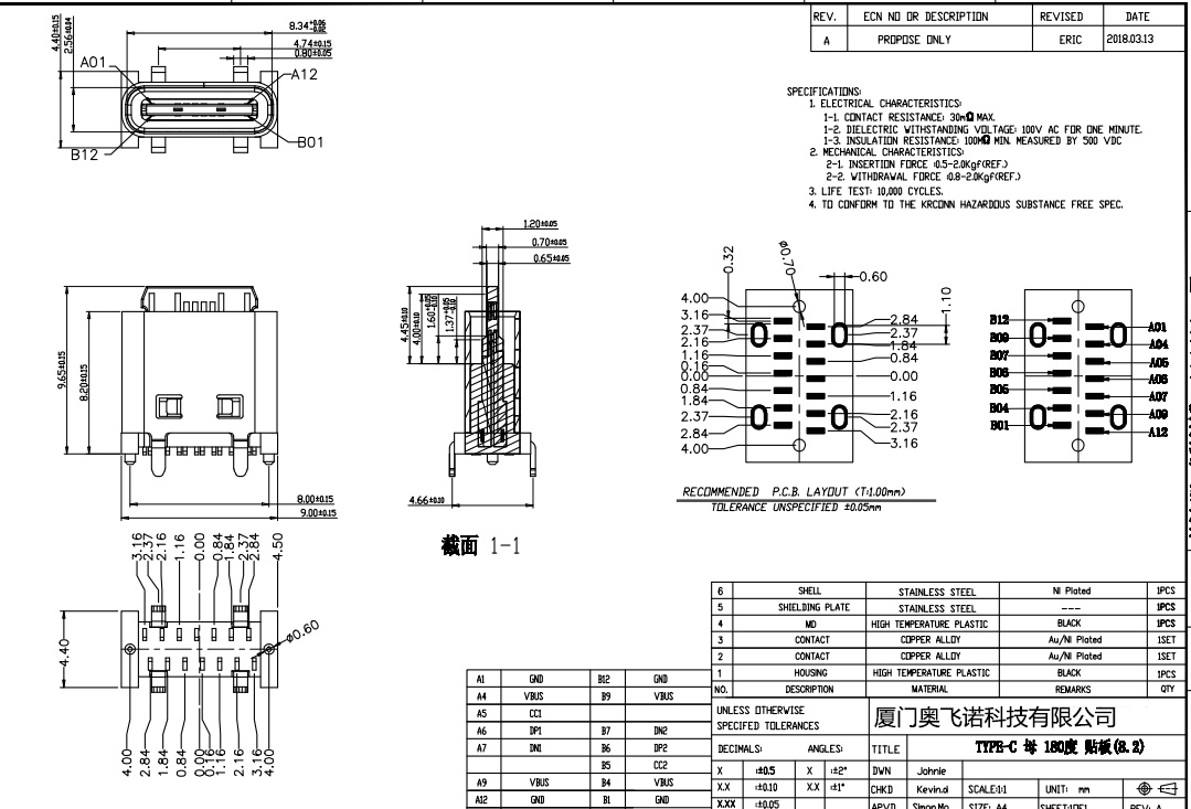TYPE C 14P母座 直立式SMT 8.0H 180度立貼 可帶外套