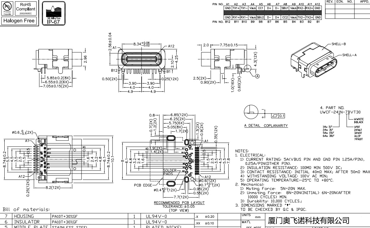 TYPE C 24P防水母座 板上兩腳插板 12P針DIP+SMT 有柱