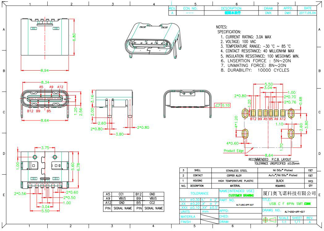 TYPE-C母座6P板上SMT腳長2.0無彈