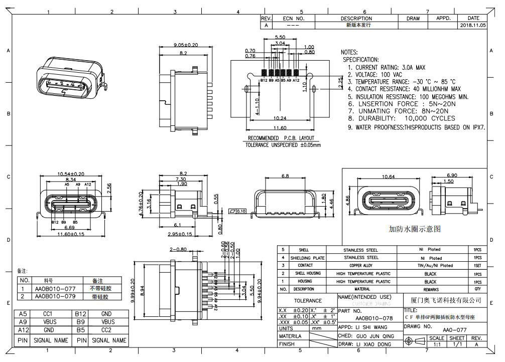 產(chǎn)品名稱:TYPE-C母座6P防水沉板0.55兩腳插板
