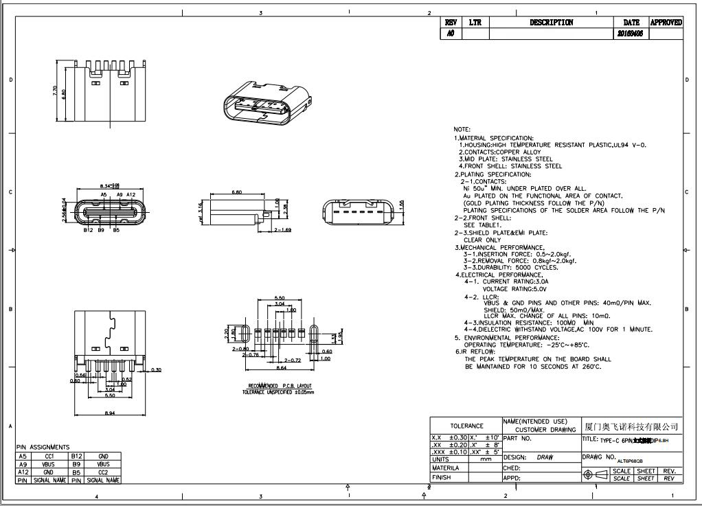 TYPE-C母座6P立式插板DIP L=6.8MM
