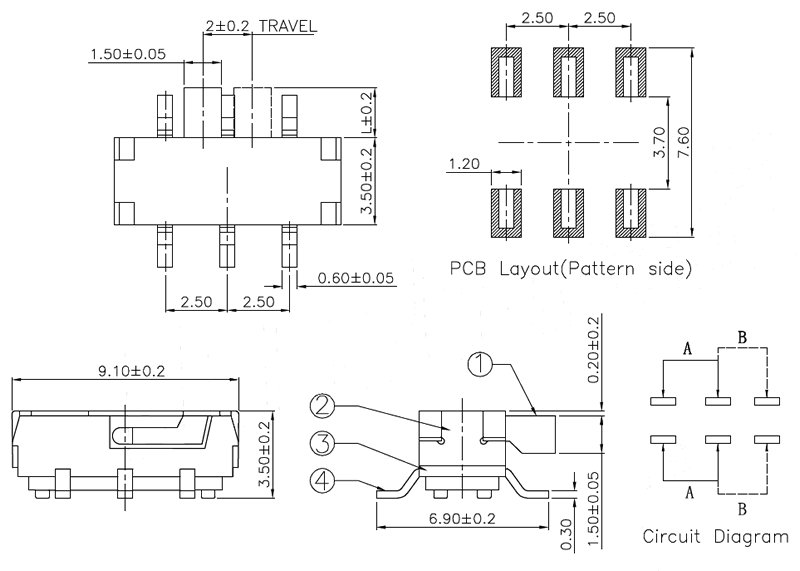 撥動開關(guān) K3-2245S 臥式90度六腳全貼 無柱 兩擋