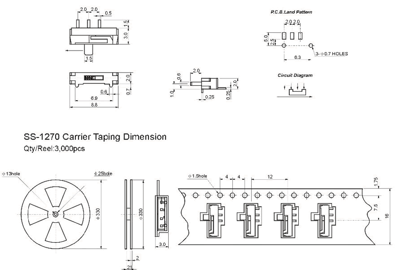 撥動開關(guān) SS-1270L 側(cè)撥臥式三腳貼片 兩檔 兩腳插板