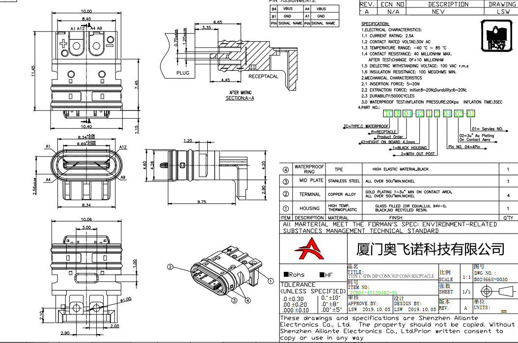 TYPE C 4P防水母座 180度焊線式帶鋼片 單面端子 舌片外露