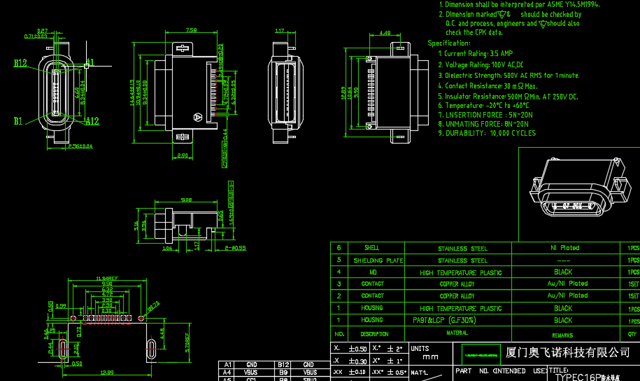 TYPE C 6P16P防水母座 板上沉板 四腳兩腳 帶螺