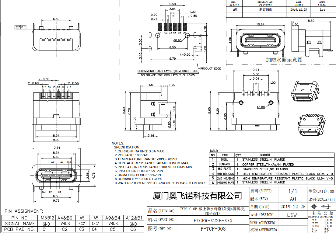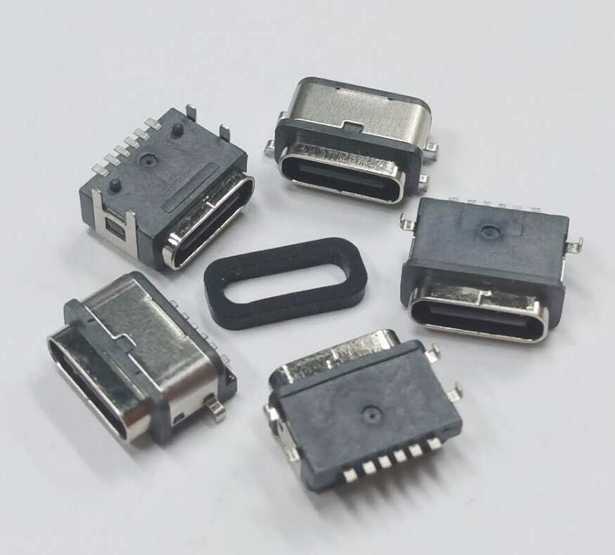 TYPE C 6P防水母座 板上沉板 四腳-后兩腳插板 有柱無柱 防水IP78