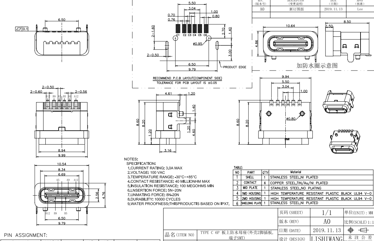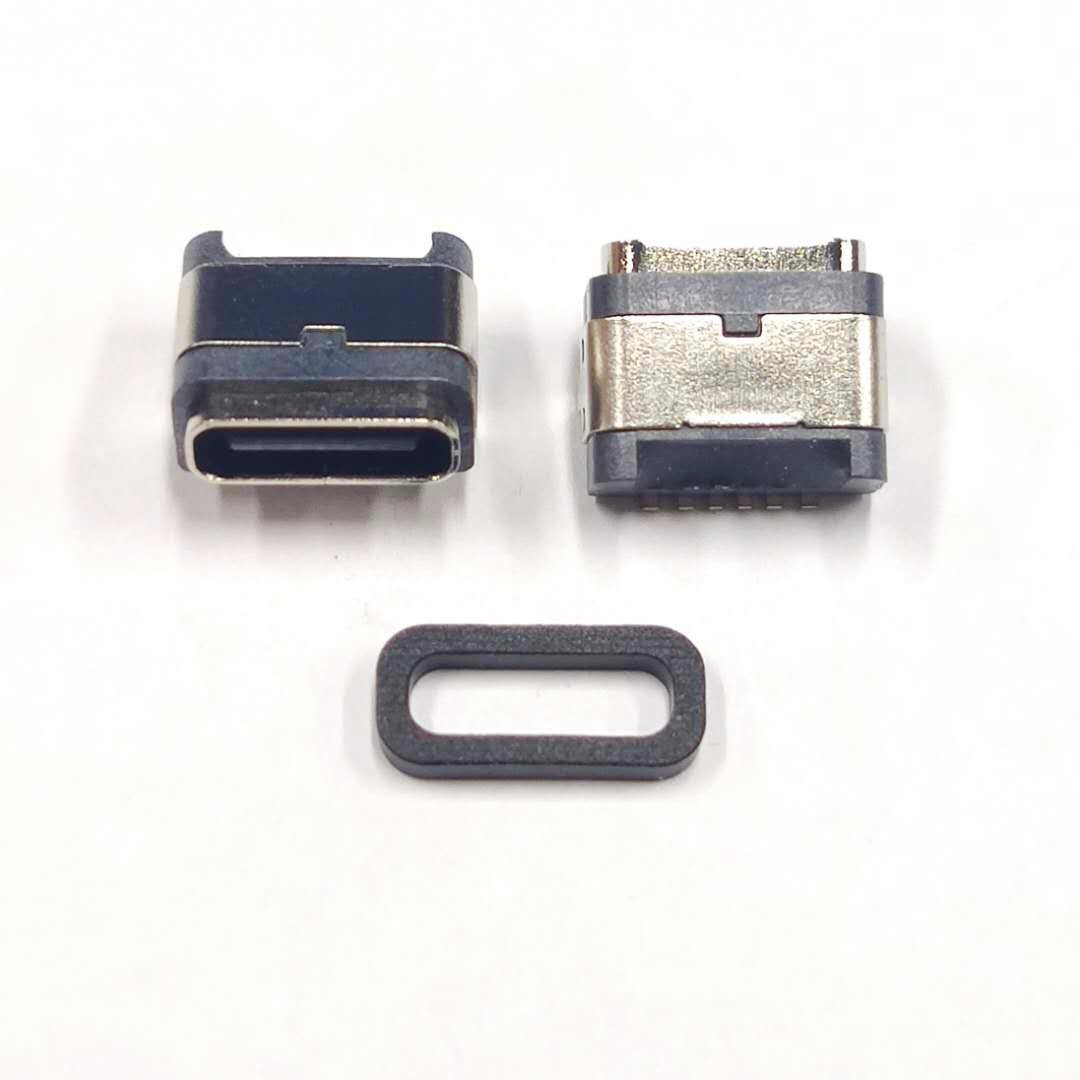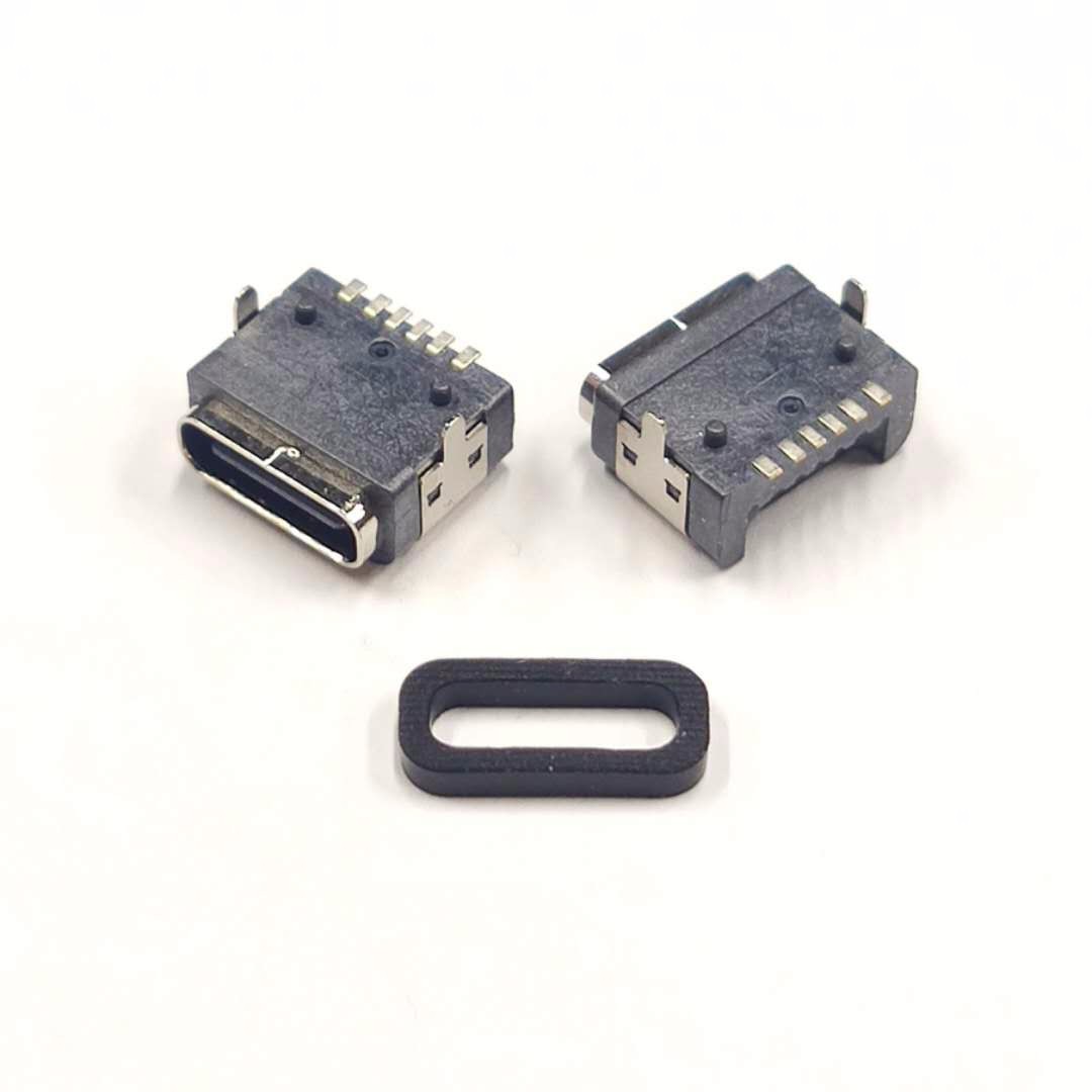 TYPE C 6P防水母座 板上兩腳插板 針貼片 有柱 點膠