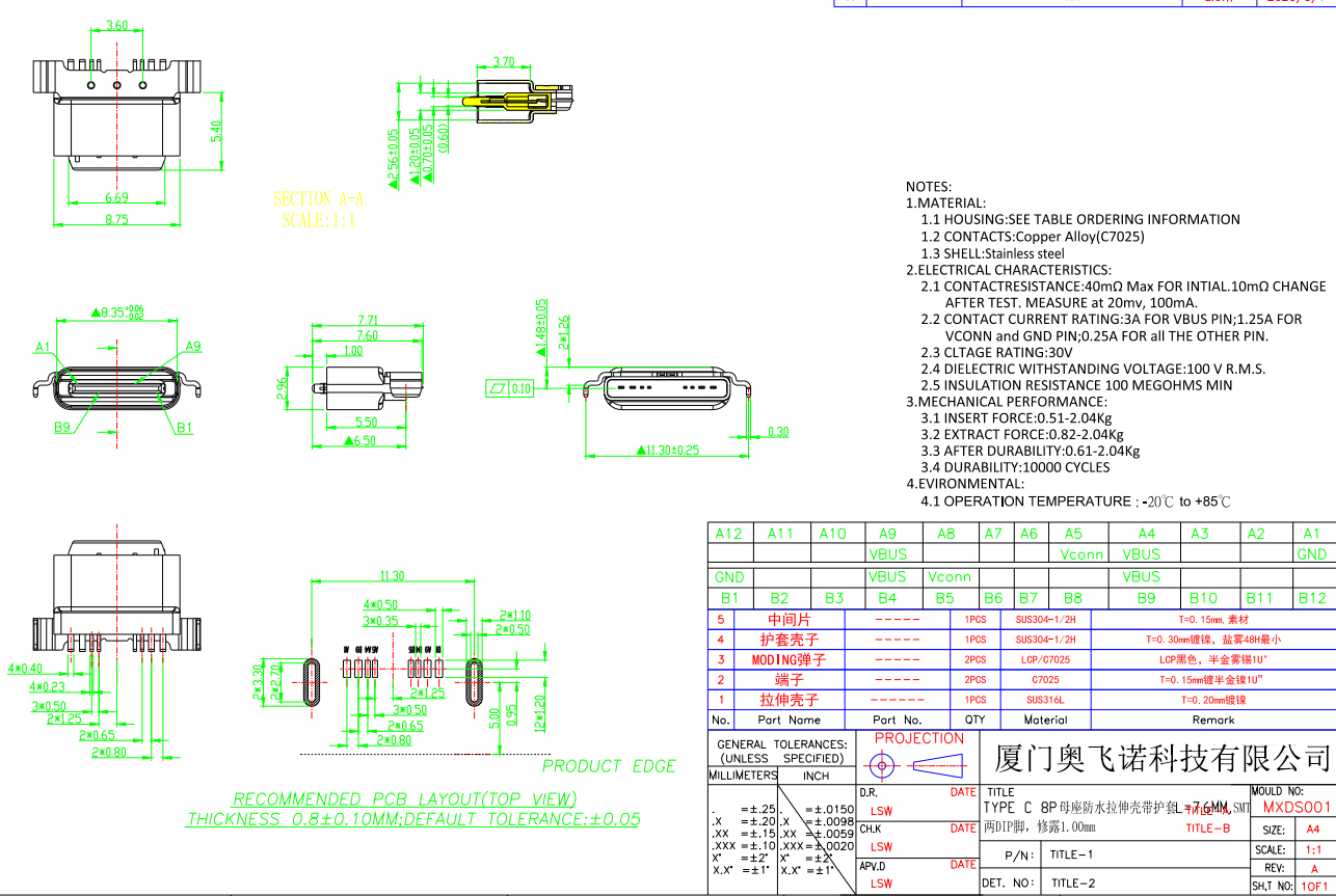 TYPE C 8P防水母座 沉板后兩腳插板 拉伸殼 外露1.0