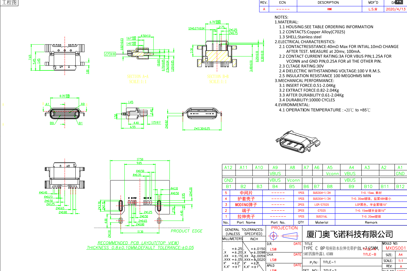 TYPE C 8P防水母座 沉板四腳插板 雙殼 拉伸殼