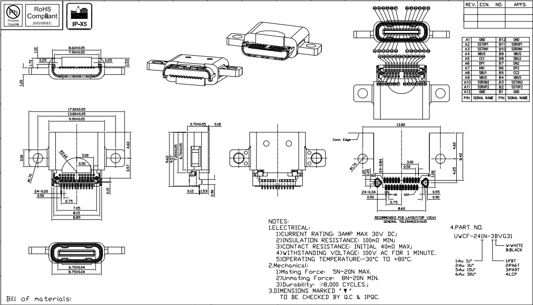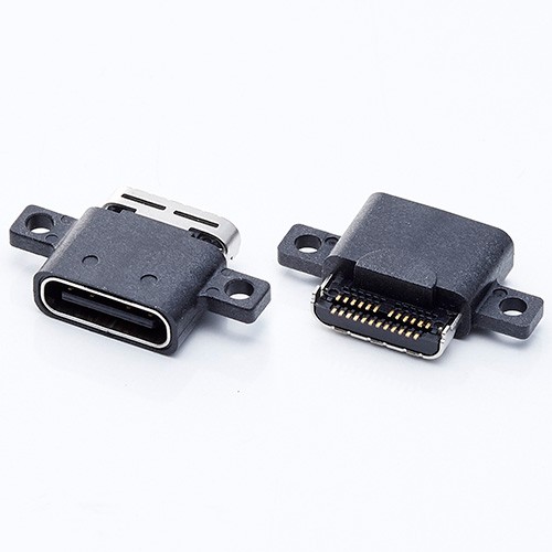 TYPE C 24P防水母座 沉板兩腳插板 全塑包膠 帶螺孔 IP-X5防水