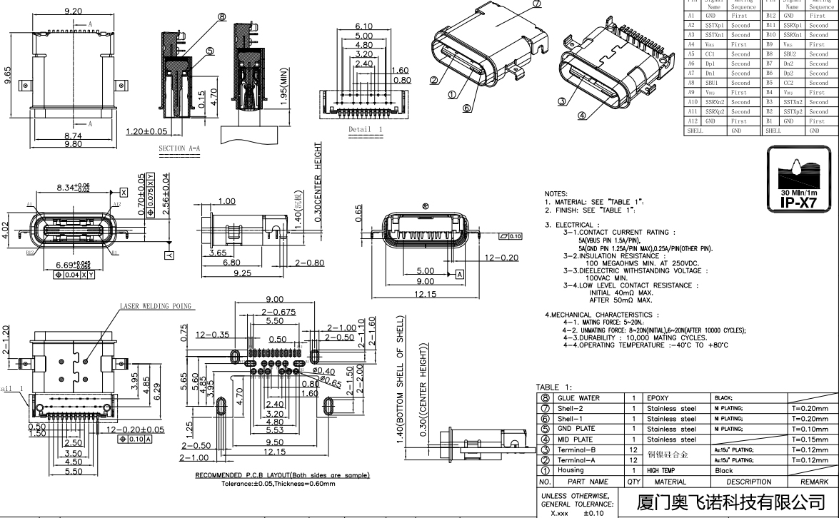 TYPE C 24P防水母座 雙殼沉板1.4四腳插板 有柱 針前插后貼 防水IPX7級