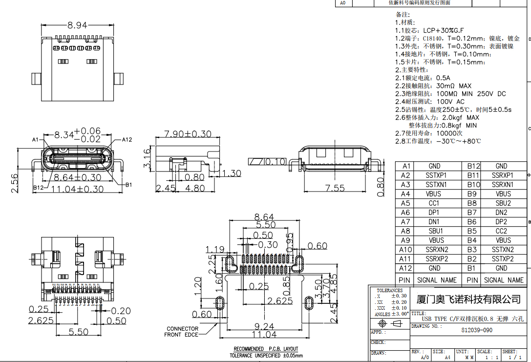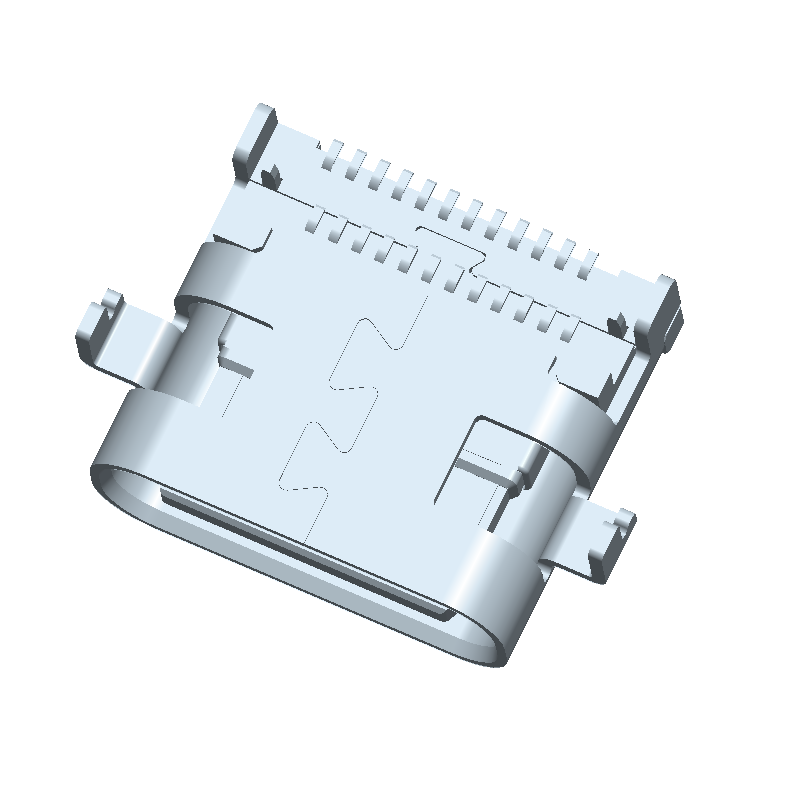 TYPE C 24P母座 沉板0.8四腳插板 有柱雙排針貼片 六孔