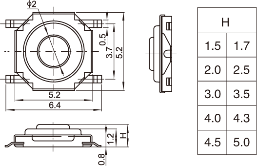 輕觸開關(guān) 5.2x5.2x1.51.72.02.53.0H 貼片正按 TS-C006