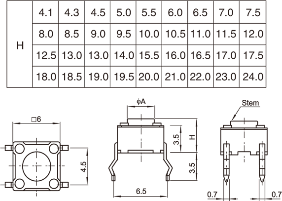 輕觸開關(guān) 6x6x4.1H~12.0高 四腳插板正按 TS-D001
