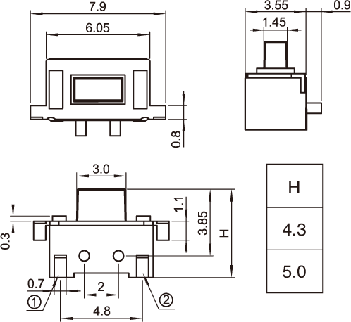 輕觸開關(guān) 3x6x4.35.0H 側(cè)按 有柱貼片 TS-B010