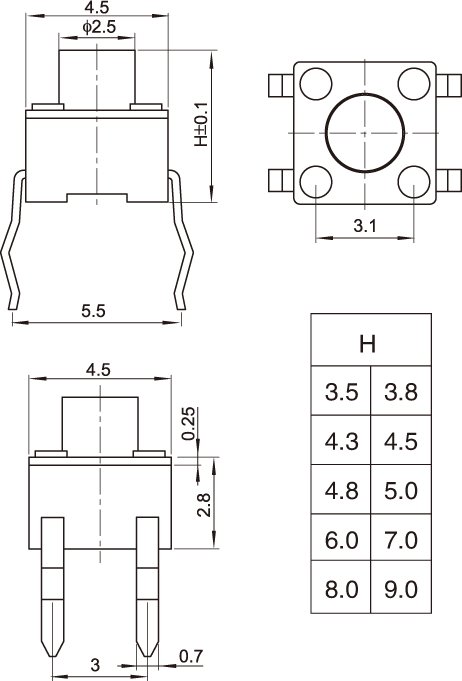 輕觸開(kāi)關(guān) 4.5x4.5x3.53.84.34.54.8H 四腳插板 正按 TS-C016