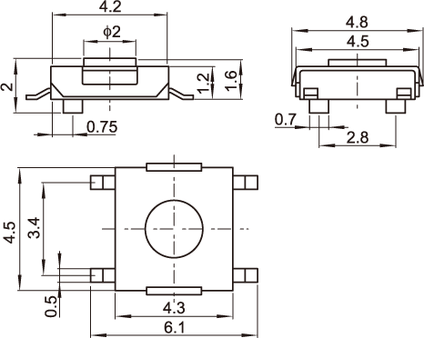 輕觸開關(guān) 4.5x4.5x1.6H 四腳貼片 有柱 正按 TS-C014