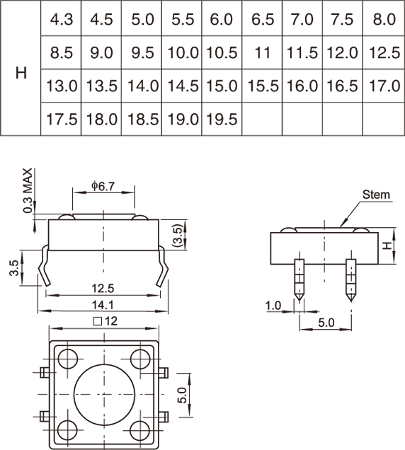 輕觸開關(guān) 12x12x4.3H~19.5H 四腳插板 無柱 TS-F001