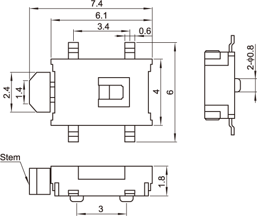 輕觸開關(guān) 3x4x7.4H 中烏龜側(cè)按 四腳貼片有柱 TS-A024