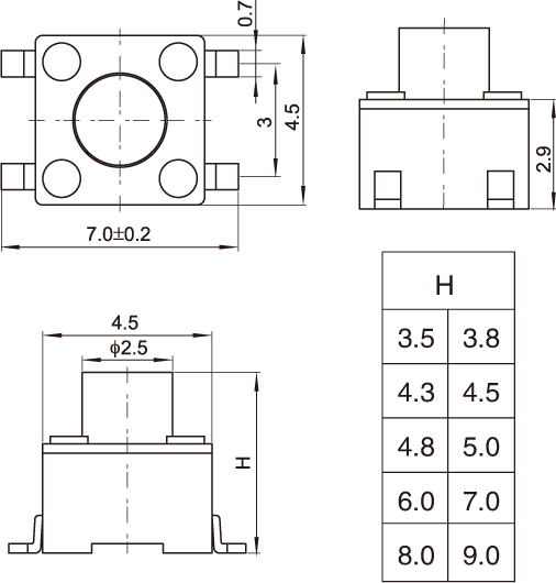 輕觸開關(guān) 4.5x4.5x5.0~9.0H 四腳貼片 正按 TS-C015