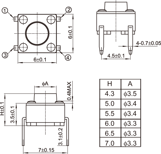 輕觸開(kāi)關(guān) 6x6x6.06.57.0H 四腳插板 正按 TS-D004
