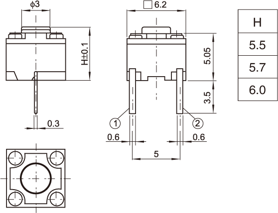 輕觸開關(guān) 6.2x6.2x5.55.76.0H 中兩腳插板 二DV TS-E008