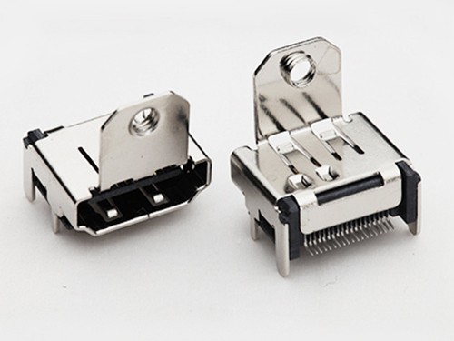 HDMI A型19P母座 90度板上四腳插板 針貼片 帶耳朵有螺孔