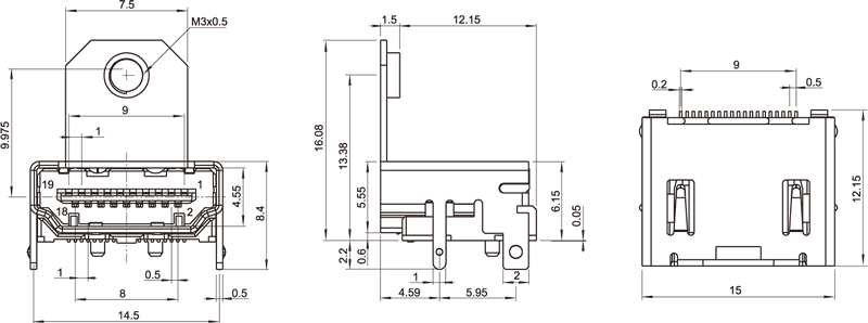 HDMI A型19P母座 90度四腳插板針貼片 帶單耳有孔