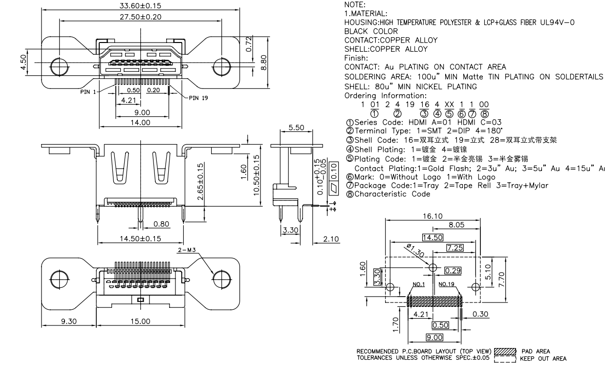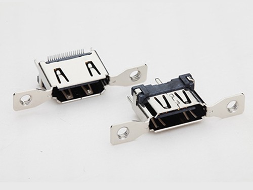 HDMI A型19P母座 180度立貼10.5H三腳插板 帶雙耳螺孔