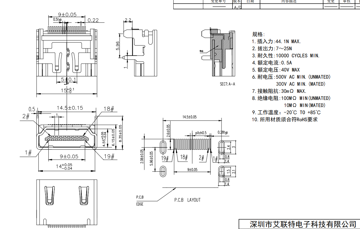 HDMI A型19P母座 板上90度四腳插板 針貼片SMT
