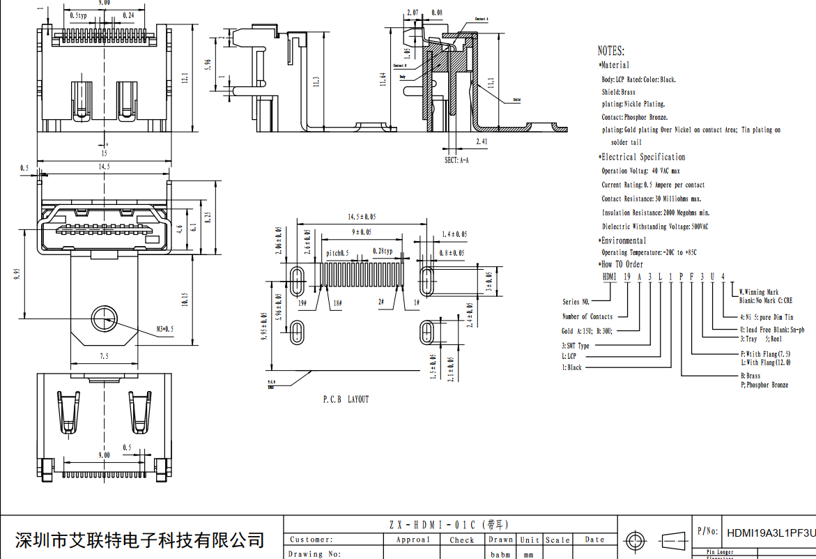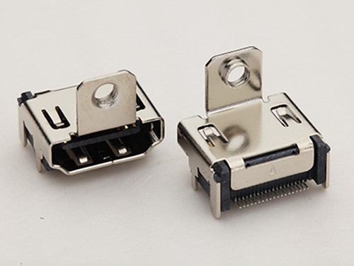 HDMI A型19P母座 板上四腳插板+針單排SMT貼板 帶單耳朵 有螺孔
